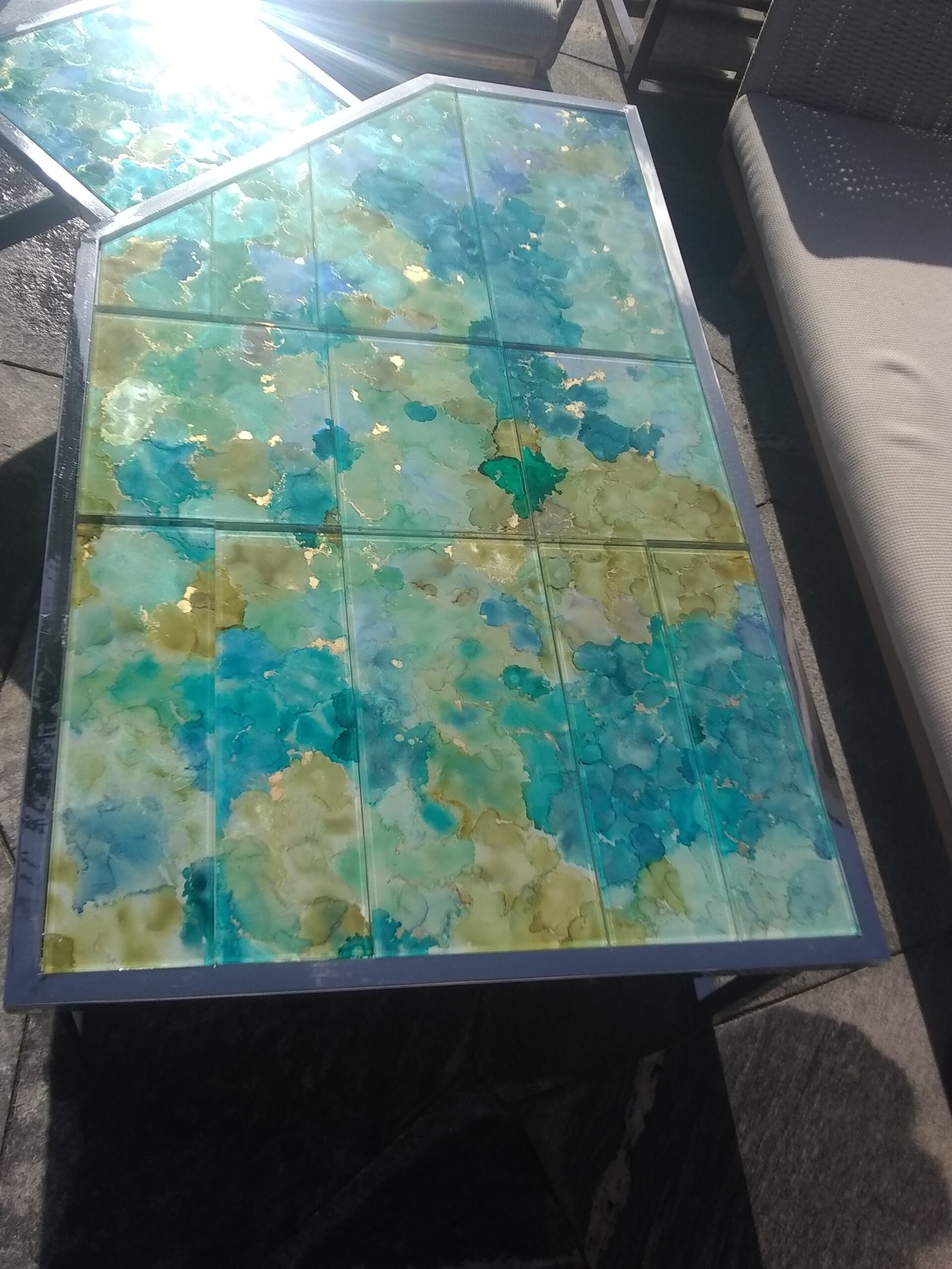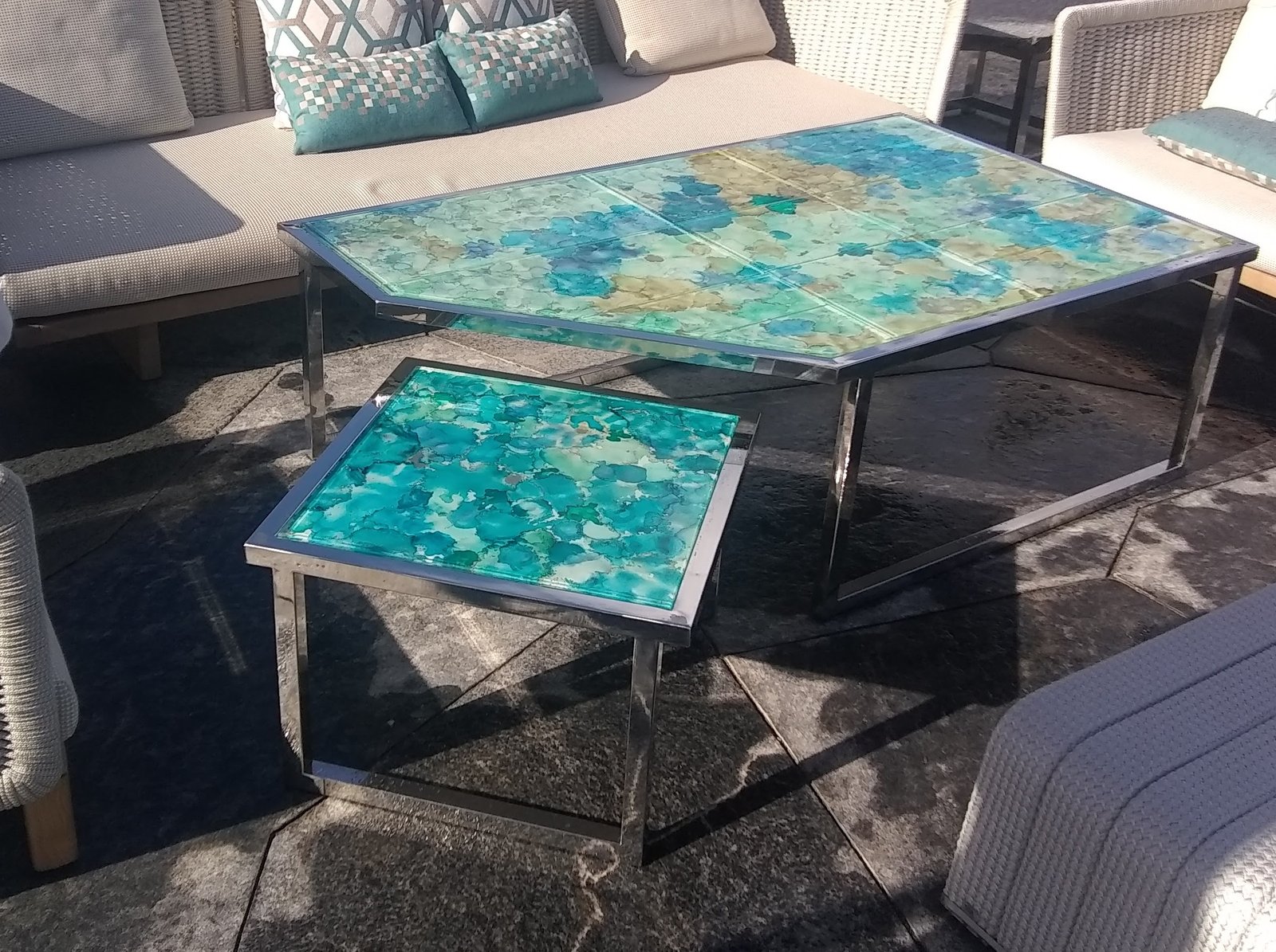 Set of tables made of stainless steel and glass painted with alcohol ink , iridiscent pigments and resin.
